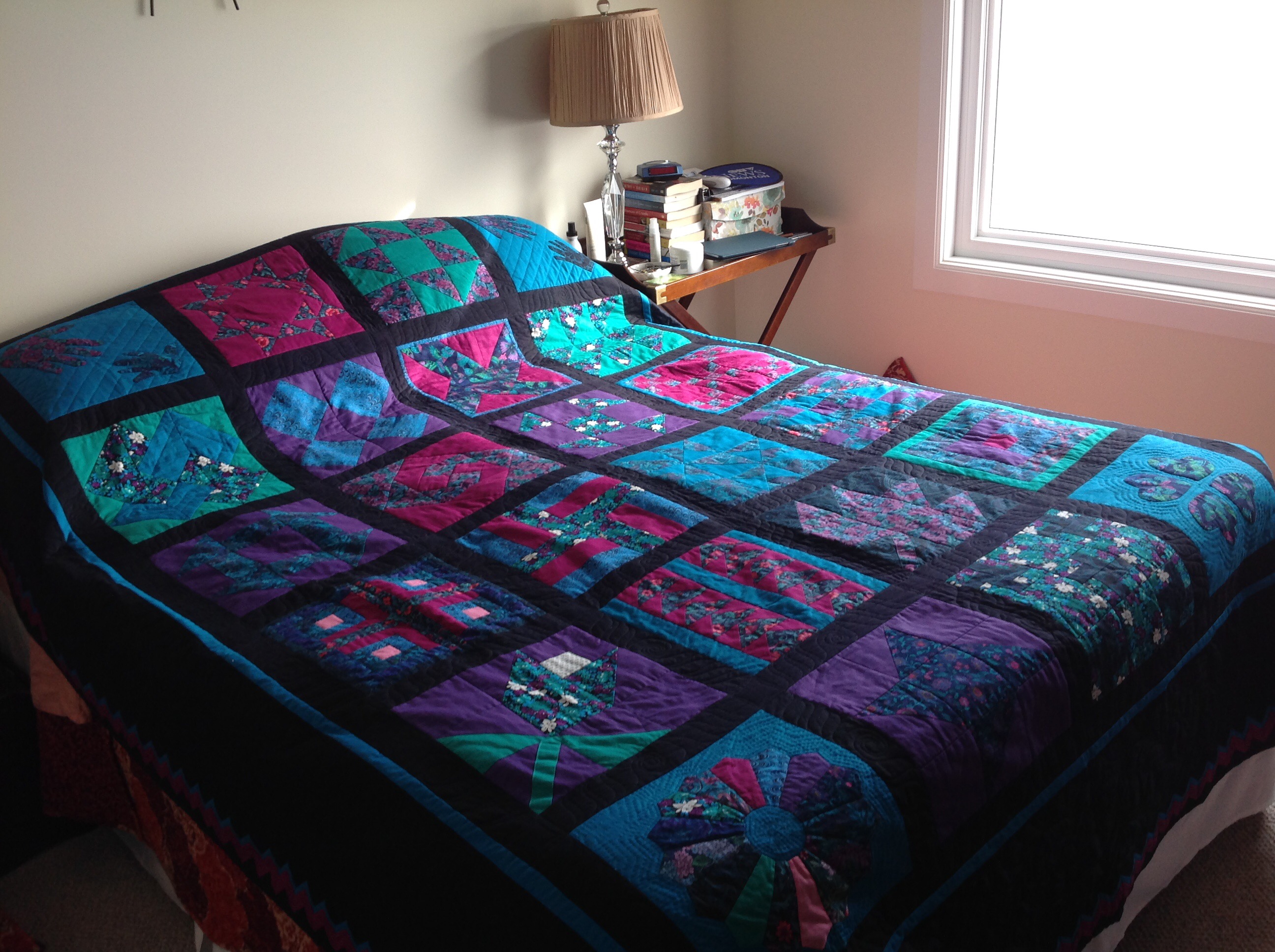 Twenty four years ago my friend Darrell made this beautiful sampler quilt. She sandwiched it, did some hand quilting and but on the binding but she never did any quilting in the 8 inch wide border. Last week she gave it to me and asked if I could put something in the border. It felt that the quilt needed some soft flowing quilting rather than lines and angles. I chose a free hand meandering feather motif. Once I was finished the border I felt that the quilt needed something to balance the dense quilting on the border with the rest of the quilt. Darrell gave me the go ahead to put a design in the black sashing around the blocks. I like the overall look now. It looks more balanced.