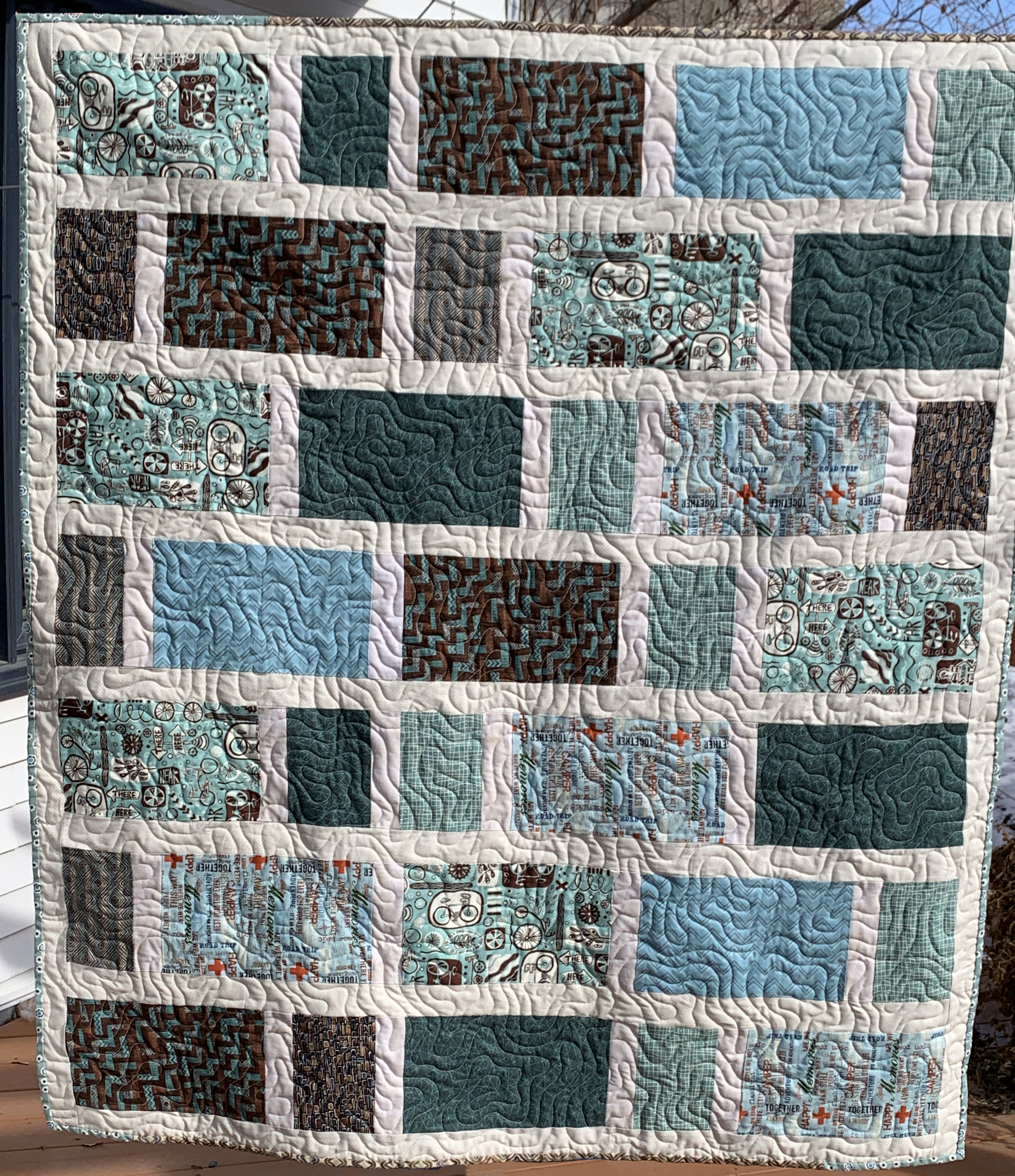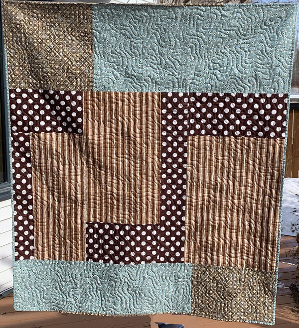 I love this modern twist on a baby quilt for a boy. It was quilted use white glide thread and pantograph Malachite.