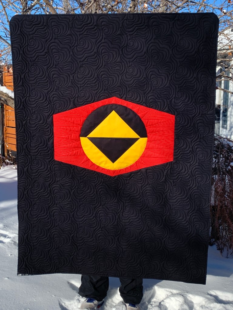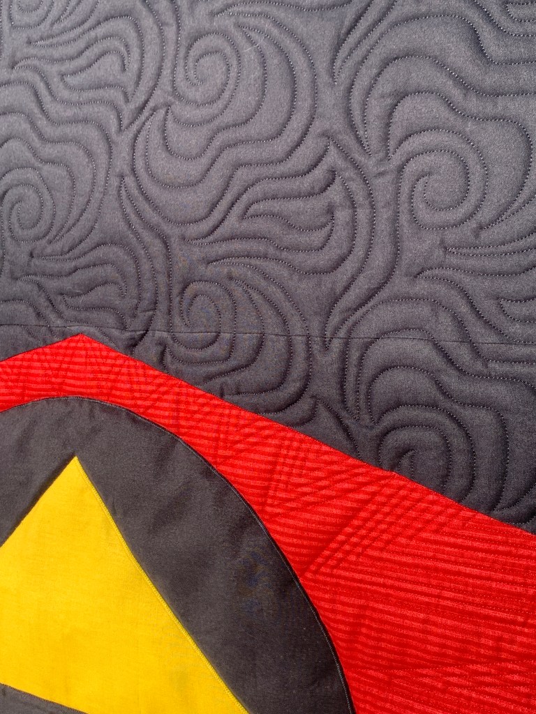 This was an interesting quilt to work on. I used an edge-to-edge design called Rhythm around the Reboot logo and then custom quilted the logo.